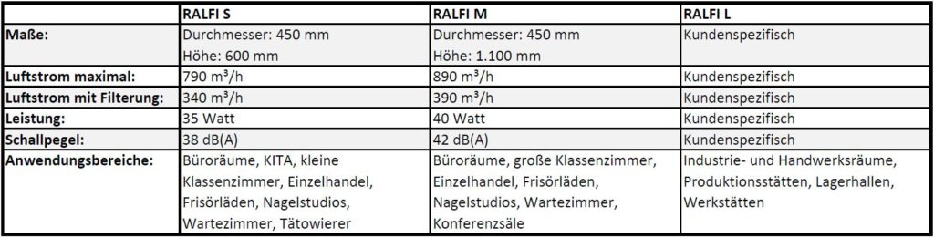 Mit einem Durchmesser von 45 Zentimeter und einer Höhe von 60 Zentimetern ist der RALFI S der kleine Kraftprotz der Reihe. Der Luftstrom von maximal 790 Kubikmetern pro Stunde (m³/h) durch das leistungsstarke Gebläse ist ausreichend für Büroräume, KITAs, kleine Klassenzimmer, für Räume im Einzelhandel, Frisörläden, Tätowierer, Nagelstudios, Apotheken oder Wartezimmer beim Arzt oder Therapeuten. Der nahezu flüsterleise Schallpegel von etwa 38 dB(A) stört nicht beim alltäglichen Leben und Arbeiten. Zum Vergleich: Ein normales Gespräch entwickelt einen Schallpegel von etwa 60 dB(A). Durch seine platzsparenden Abmaße kann er problemlos unter einen Schreibtisch geschoben werden und benötigt nicht mehr Platz als ein kleiner Schreibtischstuhl.