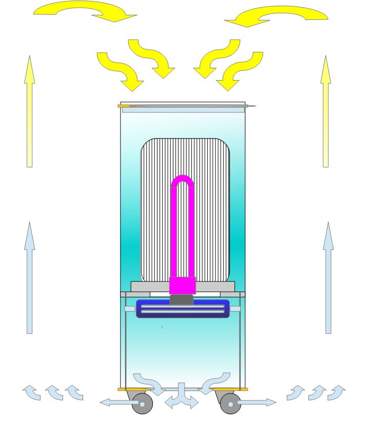 Mit seinem speziell für diese Zwecke konstruierten HEPA-System filtert RALFI effizient genau diese Stoffe aus der Luft, welche den Menschen unmittelbar an der Gesundheit schädigen können. Die durch das moderne Gebläse angesaugte Raumluft wird im ersten Schritt durch einen eingebauten Vorfilter geführt, der grobe Partikel wie Hausstaub oder Haare auffängt. Dieser Vorfilter dient primär zum Schutz der HEPA-Filterpatrone, dem Herzstück von RALFI. Nachdem die Luft vorab gefiltert wurde, wird sie durch den wartungsarmen HEPA-Filter geführt. Dieser hocheffiziente, speziell für RALFI entwickelte HEPA-Rundfilter der Filterklasse H13 (nach DIN EN1822) entfernt mehr als 99,95% der infektiösen Mikropartikel aus der durchgeführten Luft. Hinter der Filterpatrone befindet sich der Reinluft-Bereich: Hier ist auch das Gebläse verbaut, das die Luft nach unten aus RALFI hinausbefördert.